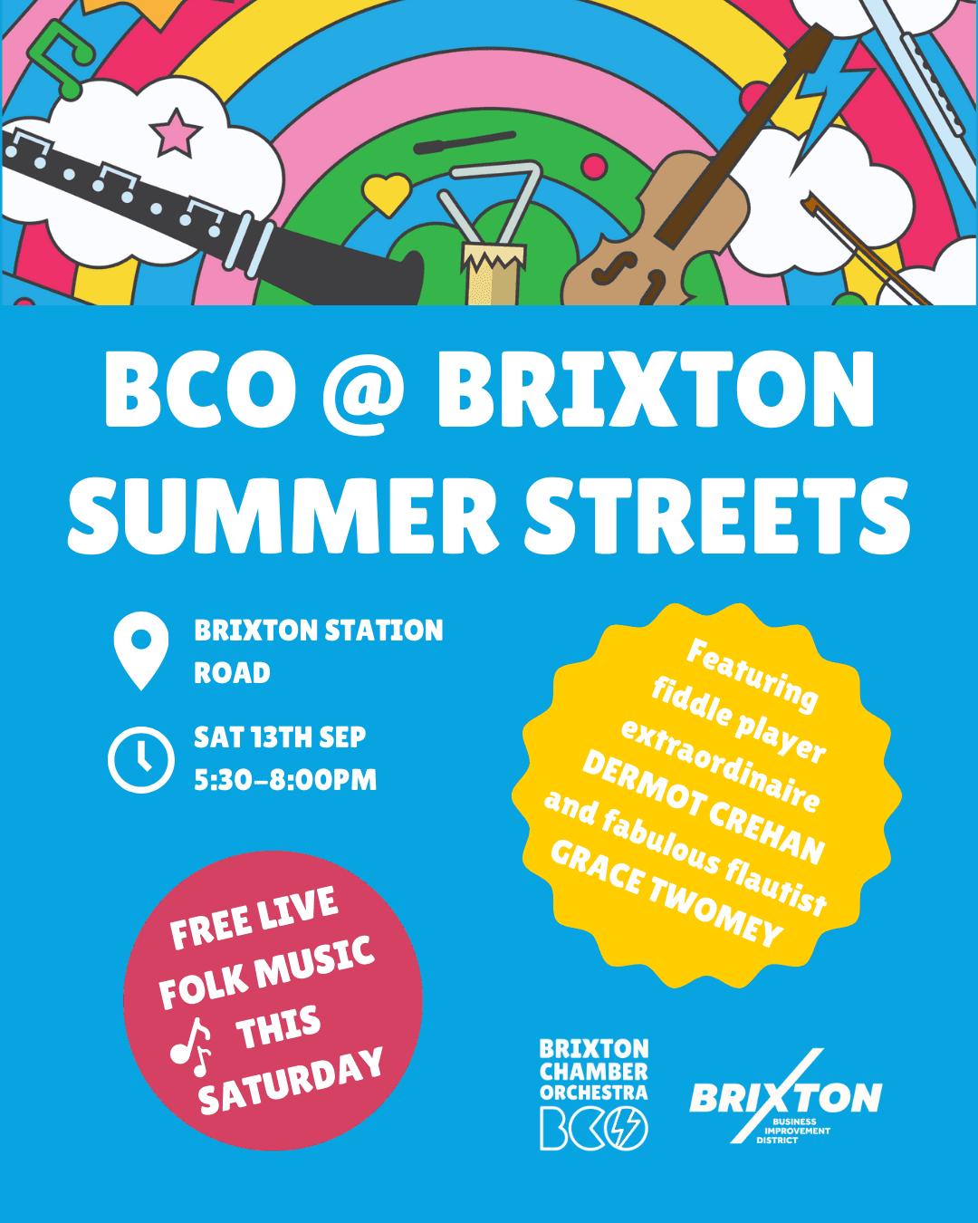 Join Brixton Chamber Orchestra for a free folk concert on Saturday 13th September, 5:30–8pm on Brixton Station Road. Featuring Dermot Crehan (fiddle) and Grace Twomey (flute). Part of the Brixton Summer Streets 2025 series. No tickets needed – just turn up and enjoy!
