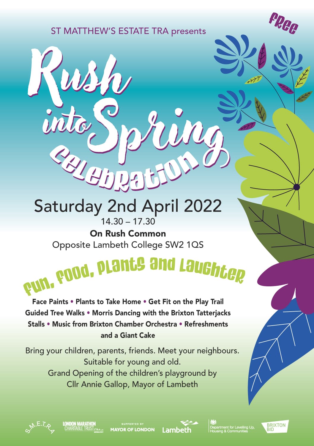 Saturday 2nd April - 2:30 - 5:30pm - Rush Common, opposite Lambeth College, Brixton Hill.