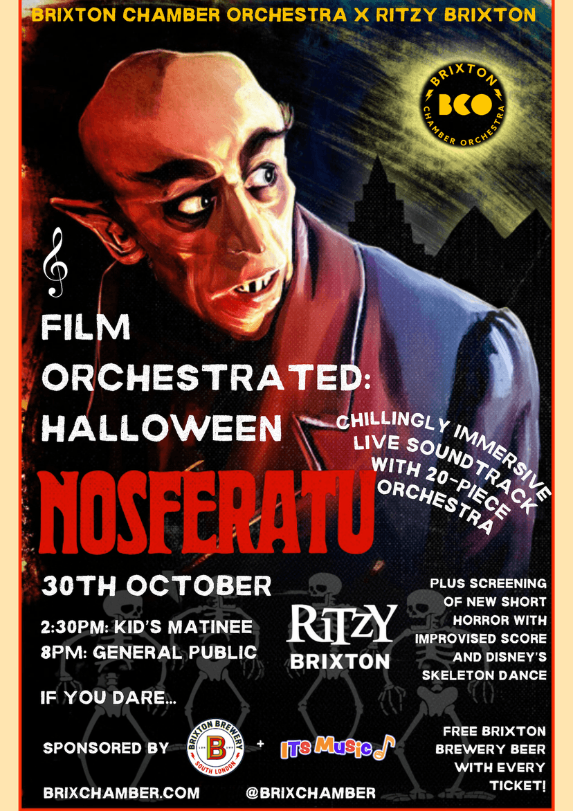 Get ready for a frightfully good time at the Brixton Chamber Orchestra's 'Film Orchestrated: Halloween' event. Join us on October 30th as we return for our third Ritzy Cinema residency in Brixton for a thrilling double feature!