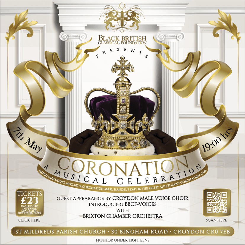 Black British Classical Foundation celebrate the Coronation of King Charles lll with a concert of music that was composed for the coronation of previous Kings & Queens. Featuring Croydon Male Voice Choir, BBCF Voices and Brixton Chamber Orchestra. Adults £25, under 18s free, tickets required.